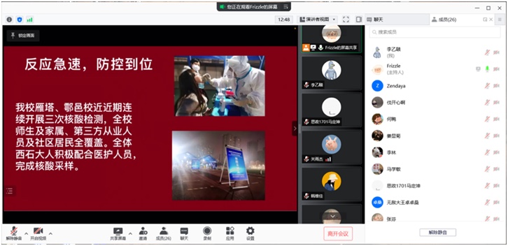 连日来西安突发的新冠肺炎疫情时刻牵动着全体西石大人的心,马克思主义学院坚决贯彻落实学校疫情防控工作部署,全院上下团结一心、众志成城,研究生各党支部、学生党员及班团干部积极发挥战斗堡垒和先锋模范作用,组织同学按时高效完成了多轮次全员核酸检测。经过精心准备,马院研2101班党支部和班委会为宣传疫情防控知识,丰富同学们的学习生活,增强同学们抗击疫情的决心和信心,组织召开了“抗击疫情 我们在行动”主题线上交流活动。